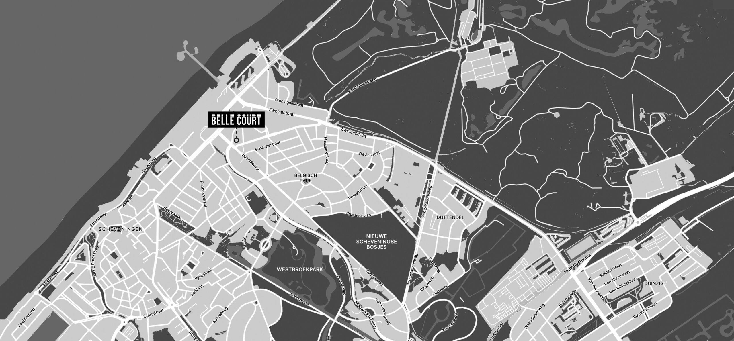 Belle Court ligt op een unieke plek tussen stad en zee. De Badhuisweg vormt de elegante entree naar Scheveningen, met het Kurhaus, de boulevard en het Belgisch Park op loopafstand. Hier wandel je van statige lanen naar duin en strand, of fiets je in enkele minuten naar de binnenstad. Alles wat Den Haag bijzonder maakt, ligt binnen bereik.